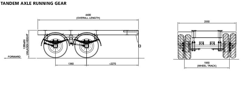 15T capacity Tridem axle leaf spring suspension with load equalizing brackets.